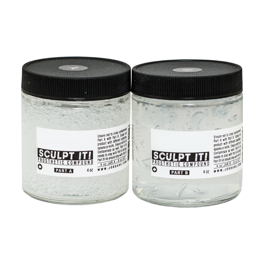Sculpt-it is a Bio-medical grade silicone modeling and casting compound curing to a soft and stretchy elastomer. It is used to create 3-D effects such as scars, cuts, moles etc. on the skin. Sculpt-It is very flexible and buildable, can be formed directly on the skin or cast in a mold. It cures rapidly and requires no heat to cure. More durable than any gelatin, and will not break down from heat or perspiration. Sticks well to itself without any glue. You can use Jordane Alcohol Activated Palette to paint on top of cured product, which will not crack, flake or chip.
