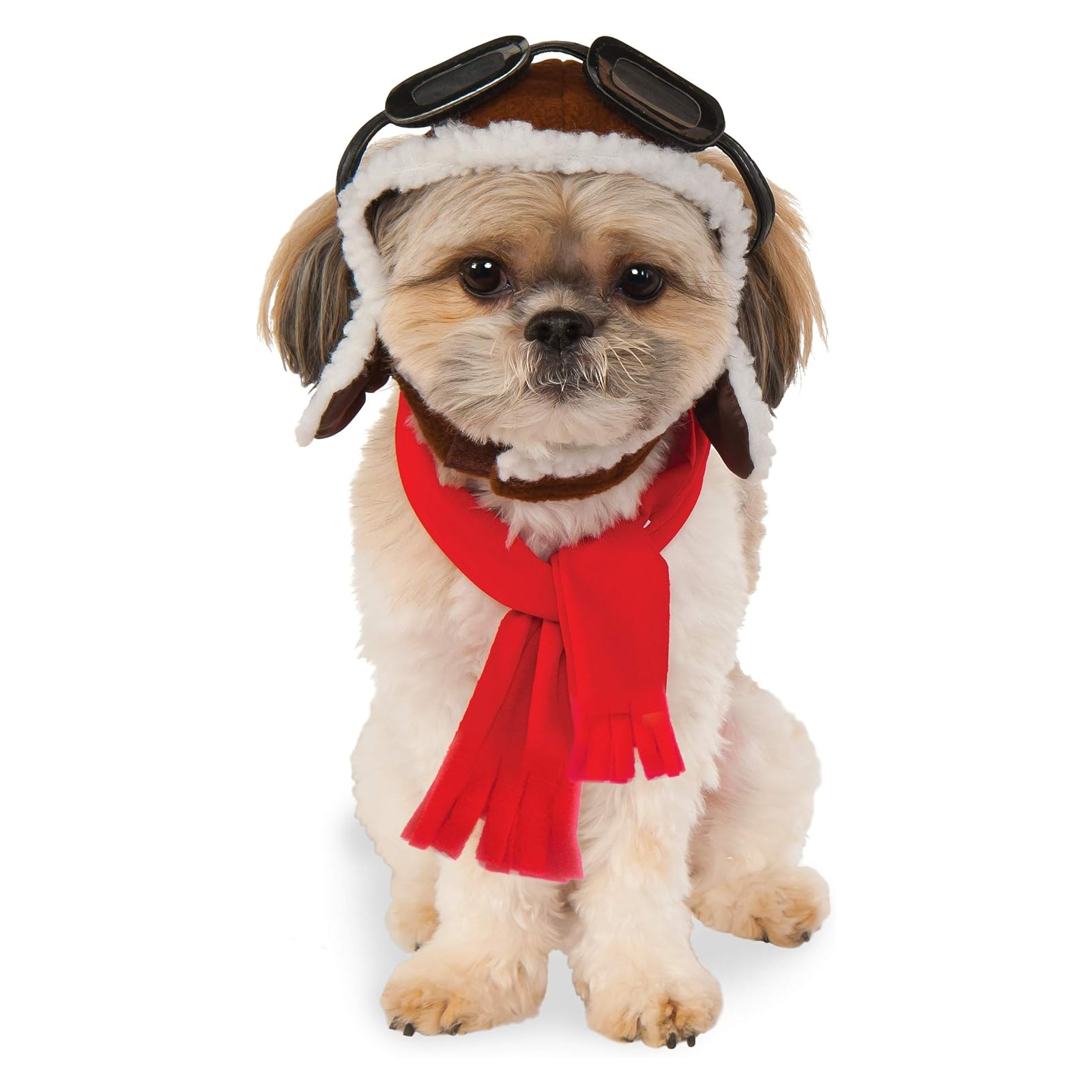 Pet costume includes aviator hat with attached goggles, and scarf