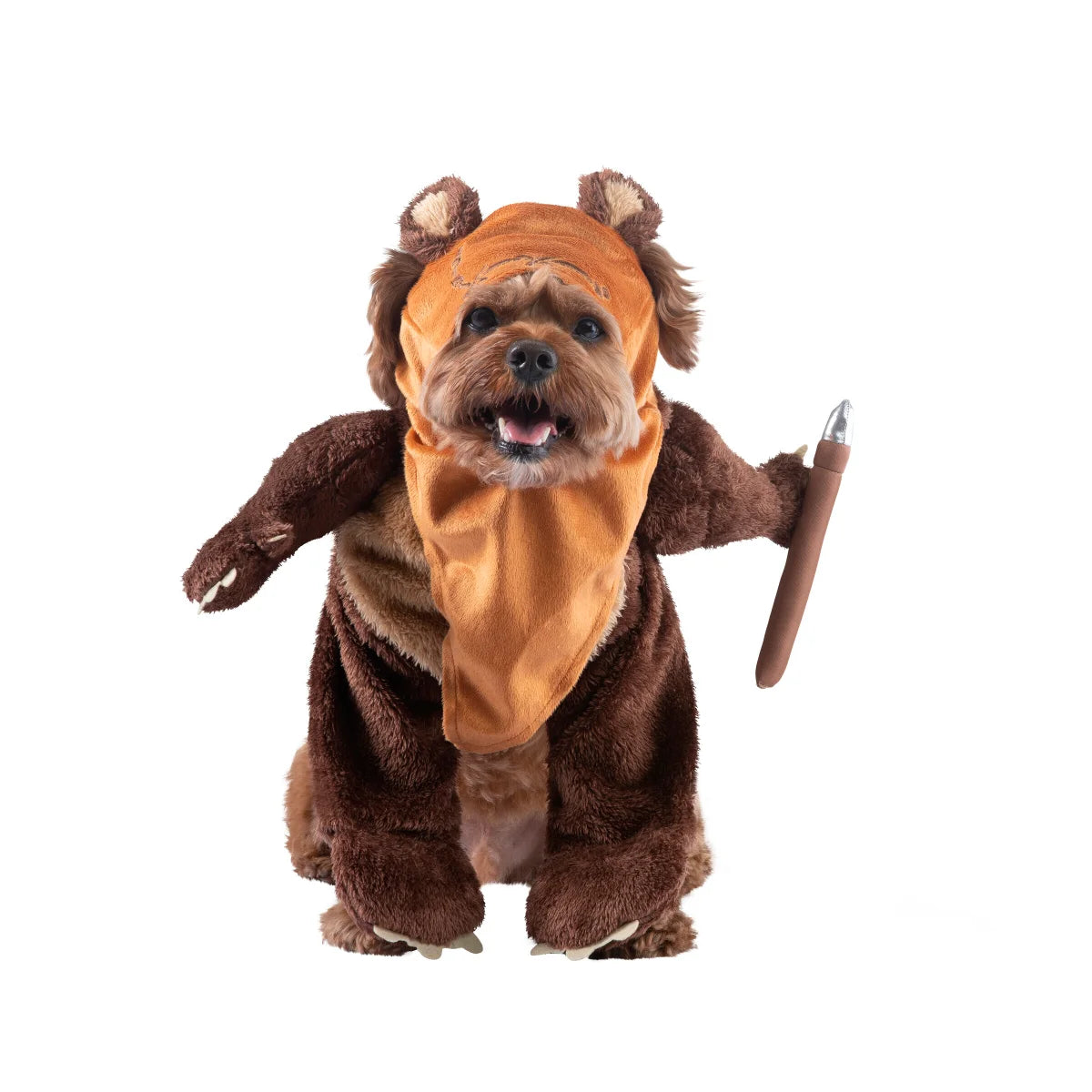 Tear down the Empire with the Star Wars Ewok Pet Costume. This pet costume is based on the first Ewok appearance in Return of the Jedi and will equip your pup with all they need to defeat galactic tyranny. The plush walker step-in suit features an embroidered headpiece with ear holes for an overall easy fit for your furry one. It also includes a stuffed spear attached to the hand, just like on Endor. Collect this Ewok Pet Costume and watch your pup liberate the galaxy.